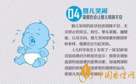 《兒科學(xué)雜志》發(fā)表了一項30多項試驗結(jié)果的分析報告顯示:煙草會增加血液和腸道里的促胃動素,加強(qiáng)胃8部和腸道的收縮,加強(qiáng)食物在腸胃的運(yùn)動,使嬰兒哭鬧的概率增加。