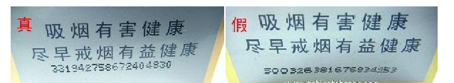 ①平放在桌上,斜角45度觀察靜止?fàn)顟B(tài)下的激光全息圖案:真品卷煙圖案表面燙金平整、干凈,能照射出影像來,且無任何污垢痕跡;假冒卷煙表面印刷粗糙,能明顯看出表面定位燙金有脫皮現(xiàn)象,污垢痕跡明顯,表面如同銅鏡上附著一層霧氣看上去較模糊不清。