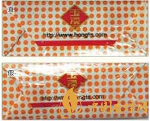 真煙小盒底部商標(biāo)紙折疊采用機(jī)械水流包裝工藝,底部兩端折疊平整且折角對等,商標(biāo)紙邊緣印刷完全性好,無脫漆掉色現(xiàn)象;假煙小盒底部商標(biāo)紙折疊多采用手工包裝,折疊不夠平整,均為“凸起”狀,商標(biāo)紙邊緣多有脫漆掉色現(xiàn)象。