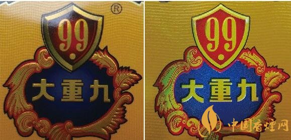 真品小盒商標(biāo)紙正面印刷工藝以藍(lán)色為底燙印“大重九”字樣,邊緣采用精雕細(xì)刻雕版燙金技術(shù),套色燙金均勻完整;假煙小盒商標(biāo)印刷采用“掃描照相”等仿制技術(shù),套色燙金嚴(yán)重失真,商標(biāo)圖案呈現(xiàn)出的效果與真品商標(biāo)圖案差異明顯。(左真右假)