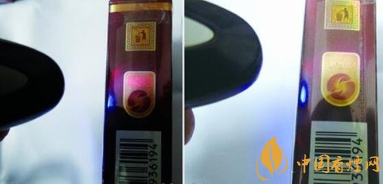 真品小盒在驗(yàn)鈔燈的照射下,防偽區(qū)立刻呈現(xiàn)出紅色“豐和”兩個(gè)字,關(guān)閉驗(yàn)鈔燈又能復(fù)原防偽區(qū);假煙在驗(yàn)鈔燈的照射下,防偽區(qū)無任何變化,與真品存在明顯差異。