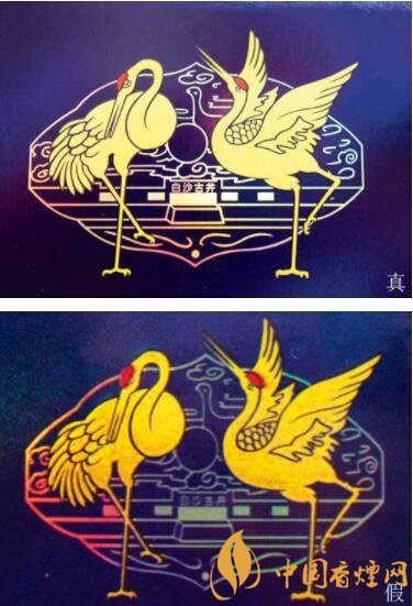 真煙的logo印刷套色分明,圖案上的鶴嘴尖部上長下短,頭頂部紅黃色層套色均勻細致,眼睛栩栩如生,“白沙古井”字體粗細一致、飽滿,整體未見顏色圖層重復、錯位情況;假煙的logo印刷顏色死板,圖案上的鶴嘴部上下長短幾乎一致,鶴頭頂部紅黃色層套色有明顯錯位,眼部線條粗細不一、且因套色錯層導致眼睛看上去無神,“白沙古井”字體粗細不一、印刷線條偏細,顏色圖層有重復、錯位情況。