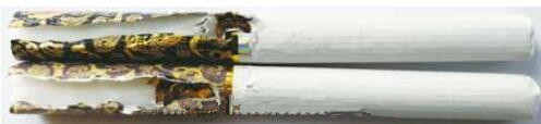 真煙煙支采用單一醋纖濾嘴,過(guò)濾嘴長(zhǎng)度為30mm;假煙煙支過(guò)濾嘴較短長(zhǎng)度約為22mm,與真品特征存在明顯差異。