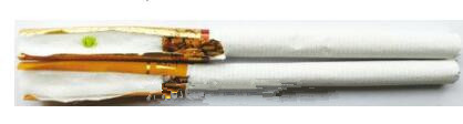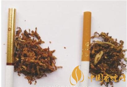 真煙煙支采用爆珠濾嘴,中間有一顆綠色的小爆珠,接裝紙顏色為金黃色,長度為40mm;假煙煙支采用單一醋酸濾嘴,接裝紙顏色為黃色,長度為34mm,與真品特征存在明顯差異。