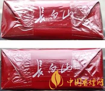 真品卷煙:1.拉線頭形狀為飽滿(mǎn)的半橢圓形。2.透明紙上烙鐵痕跡寬且明顯。3.商標(biāo)紙超線印刷長(zhǎng)白山圖案和logo圖案,側(cè)光觀察明亮、清晰。