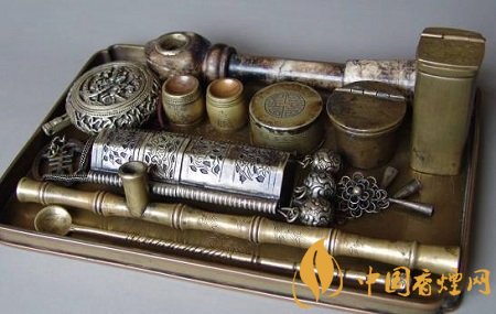 “四四方方一座船,船內(nèi)有水船外干;只見船上著了火,不見失火著了船。”“小小杯杯,裝點(diǎn)毛毛,稀里呼嚕,冒出灰灰”。明朝晚期,絲煙盛行,水煙漸漸風(fēng)靡一時(shí),這種狀如手槍,重約750克的水煙,因造型美觀大方廣受歡迎。而鄉(xiāng)間開始流行類似的水煙筒。嘴吸水煙袋(筒),通過清水產(chǎn)生負(fù)壓,煙氣通過水過濾吸入口中,據(jù)說煙味更醇香,入口更柔和。與煙槍一樣,水煙也配套有煙袋、煙包、煙葫、煙火等煙具。