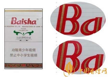 假冒卷煙:背面Baisha拼音字母膠印,紅色與白色交界位置無(wú)鋸齒痕跡。