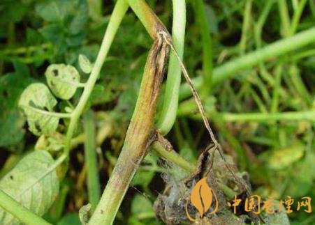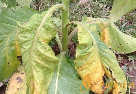 癥狀:煙草青枯病是維管束病害,典型癥狀為枯萎,病株多為一側(cè)枯萎,拔出后可見(jiàn)發(fā)病的一側(cè)支根變黑腐爛,未顯癥的一例根系大部分正常。葉片發(fā)?。撼跗谲浕?,但仍為青色,故稱(chēng)“青枯病”,隨著細(xì)菌充滿(mǎn)葉脈,兩天后葉脈變黑,葉內(nèi)為黃色網(wǎng)狀病斑。莖發(fā)?。撼霈F(xiàn)長(zhǎng)形黑色條斑,有的條斑擴(kuò)展到病株頂部或枯萎的葉柄上。到發(fā)病中后期,全部葉片萎蔫,條斑表皮變黑腐爛,病株莖和葉脈導(dǎo)管變黑,根部也變黑腐爛,甚至莖髓部呈蜂窩狀或全部腐爛形成空腔,僅留木質(zhì)部。橫剖病莖用力擠壓切口,從導(dǎo)管溢出黃白色菌膿。