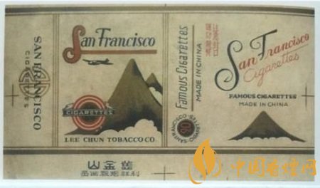 上世紀(jì)三十年代,由利群煙廠出品的“舊金山”牌卷煙,為橫版。煙標(biāo)上由紅色大寫英文字母“S”帶出的“San Francisco”品名,舞動(dòng)感十足。其下兩座金山上,一架飛機(jī)翔過,山腳旁畫有三個(gè)重疊的紅色圓圈,一圈一圈又一圈,像極了煙蒂的火苗生生不息,在此中間寫有“CIGARETTES”,別出心裁地交代了“舊金山”牌卷煙的品質(zhì)和規(guī)格。副版的文字多于圖案,草寫的英文煙標(biāo),重復(fù)豎寫橫寫的“Famous cigarette”,左上角“注意封口、謹(jǐn)防假冒”八個(gè)中文字的提示,卻很醒目。當(dāng)時(shí)的煙標(biāo)設(shè)計(jì),以提示的文字顯現(xiàn),確不多見。整張煙標(biāo)幾乎鋪滿了“舊金山”牌卷煙所要表達(dá)的內(nèi)容。