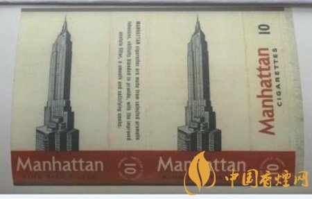 上世紀(jì)四十年代,美國煙公司出品了“曼哈頓”牌香煙,為10支裝規(guī)格。正版與副版均畫有曼哈頓的標(biāo)注性建筑——帝國大廈。帝國大廈建于1931年4月,是紐約的地標(biāo)建筑物之一。它高381米,共有103層。它是一座多功能寫字樓,也是旅游景點(diǎn)。上世紀(jì)四十年代,帝國大廈是全球最高的大廈,后被世貿(mào)雙子塔取代。世貿(mào)雙子塔被毀后,帝國大廈重又成為最高大廈。煙標(biāo)底部紅色實(shí)心框內(nèi),寫有粗體英文“Manhattan”煙標(biāo)名稱,騎縫處寫有三行曼哈頓香煙的產(chǎn)品介紹。整張煙標(biāo),巍峨雄偉的銀灰色帝國大廈,在正副版上遙相呼應(yīng),嘆為觀止。