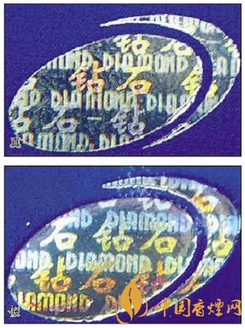 真煙鉆石圖案印刷清晰,色彩感強(qiáng),內(nèi)有微縮英文字母“DIAMOND”,圖案無凹凸感;假煙印刷不清晰,用手摸上去有凹凸感。