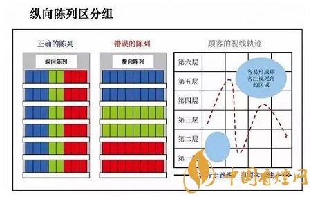 縱向陳列較橫向陳列更符合顧客視線(xiàn)軌跡的運(yùn)行,能最大限度地提升顧客對(duì)排面的關(guān)注,避免顧客視線(xiàn)死角的形成。如下圖: