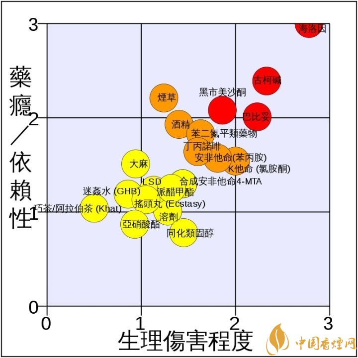 結(jié)尾分享一下剛看到的研究發(fā)現(xiàn)。20位從事依賴性治療的精神病醫(yī)師,在二十種常見(jiàn)管制藥品比較其傷害性(橫軸)及成癮性(縱軸),于2007年發(fā)表在權(quán)威醫(yī)學(xué)期刊《柳葉刀》,顯示煙草在成癮性排名第三,潛在危害程度排名第七,可見(jiàn)煙草的依賴性和傷害可能比某些傳統(tǒng)毒品還大。
