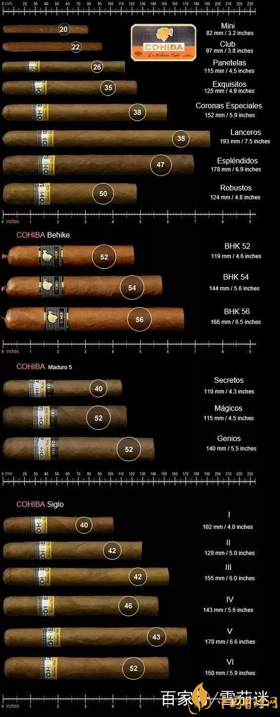 哈伯納斯旗下的 27 個古巴品牌雪茄,長度基本在 100mm-230mm 之間,環(huán)徑基本在 10.4-22.8 mm之間。