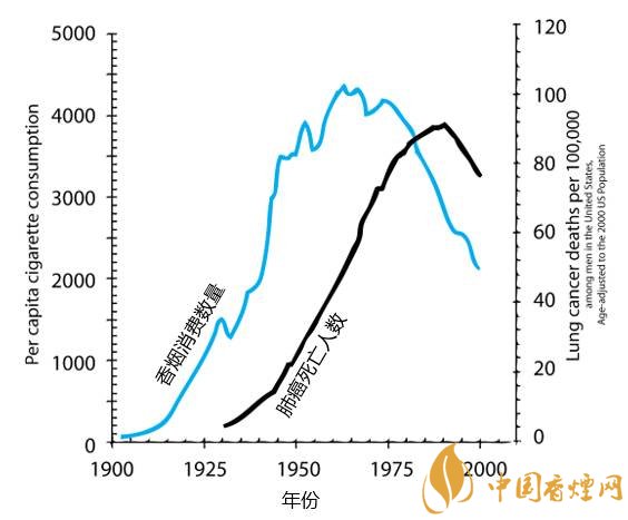 大家一看這個圖,就會發(fā)現(xiàn)吸煙數(shù)量和肺癌死亡數(shù)量的曲線幾乎一模一樣,但有大約25年的滯后:吸煙增加,肺癌會在25年后相應(yīng)增加,吸煙減少,肺癌也會在25年后相應(yīng)減少。這個奇特的滯后主要是因為肺癌發(fā)生是個非常慢的過程,從癌前變異,到早期癌癥,到晚期癌癥,一般需要10~20年時間。