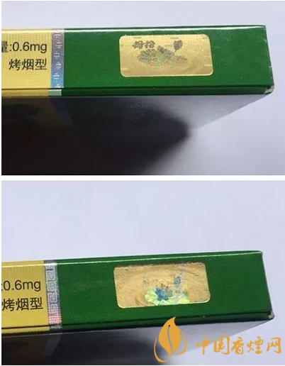 假煙采用普通仿制技術(shù),顏色搭配較為死板,花蕊處金色線條模糊、擠成一團,圖案印刷粗糙、立體感差。