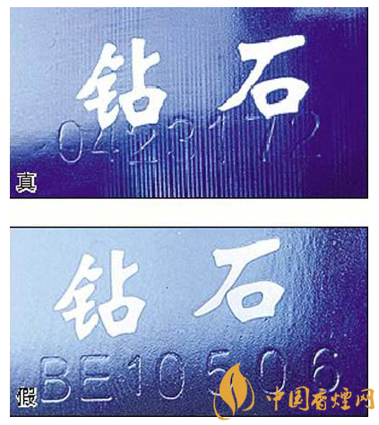 五看鉆石圖案:真煙鉆石圖案印刷清晰,色彩感強,內(nèi)有微縮英文字母“DIAMOND”,圖案無凹凸感;假煙印刷不清晰,用手摸上去有凹凸感。