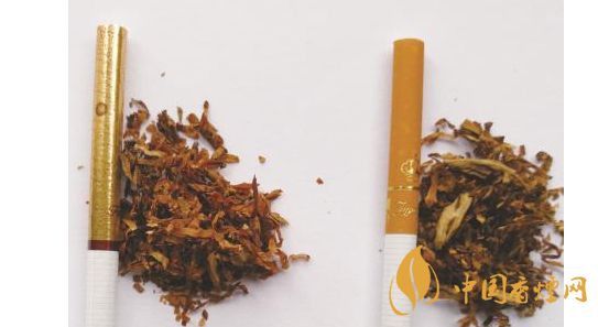 煙絲差異對(duì)比:真煙煙絲切絲寬度均勻,煙絲疏松、光澤油潤(rùn)性好,呈檸檬黃色,煙絲結(jié)構(gòu)為純?nèi)~絲;假煙煙絲切絲寬度不勻,光澤油潤(rùn)性較差,煙絲結(jié)構(gòu)為葉絲和少量梗絲,與真品特征存在明顯差異。