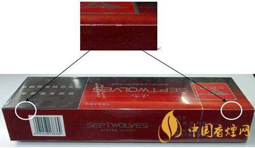 由于印刷方式的不同,真品“七匹狼”(豪情)條、盒上的中英文字體邊緣有鋸齒狀,假煙的字體邊緣光滑。
